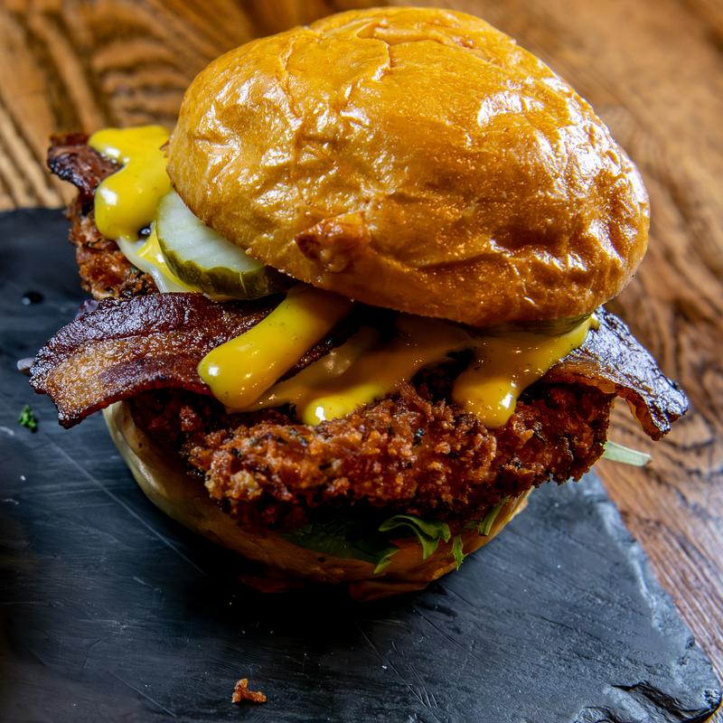 Fried chicken thigh, American cheese, bacon, hot pickles, honey mustard on brioche