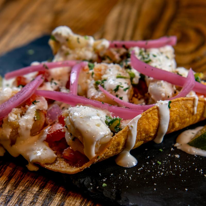 Sauteed shrimp, pico de gallo, pickled onion, lime crema, cotija