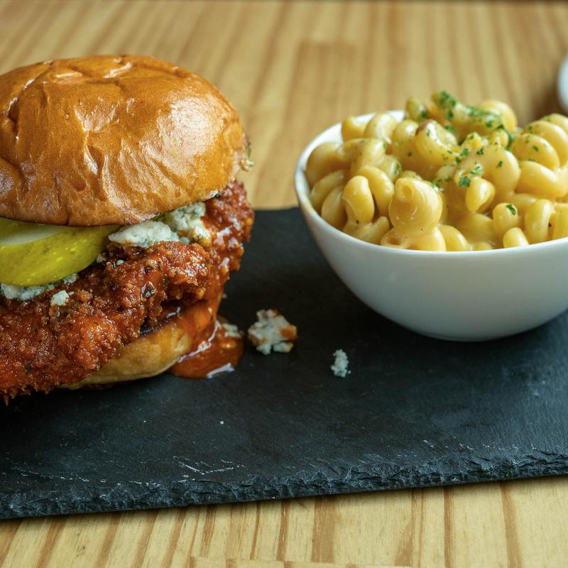 Fried or grilled chicken in 3’s Company sauce, bleu cheese crumbles, pickles with slaw on brioche
